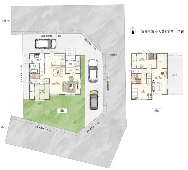| 設備 | 温水洗浄便座、トイレ2ヶ所、追焚機能、浴室乾燥機、システムキッチン、カウンターキッチン、食器洗浄乾燥機、ウォークインクローゼット、洗髪洗面化粧台、浄化槽、モニタ付インターホン、庭、駐車場3台分 | ||