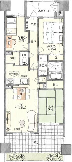 | 間取り | 3LDK | 間取り内訳 | 和6畳×1室 洋6.4畳×1室 洋5畳×1室 |