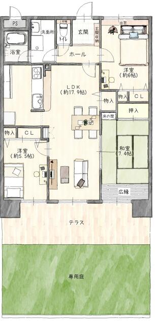 | 間取り | 3LDK | 間取り内訳 | 和7.4畳×1室 洋6畳×1室 洋5.3畳×1室 LDK13.4畳×1室 |