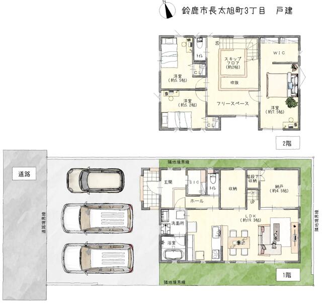 | 設備 | 温水洗浄便座、トイレ2ヶ所、システムキッチン、カウンターキッチン、IHクッキングヒーター、浄水器、食器洗浄乾燥機、ウォークインクローゼット、床下収納、洗髪洗面化粧台、照明器具、電気、上水道、下水道、浄化槽、複層ガラス、エアコン、モニタ付インターホン、ディンプルキー、駐車場3台分、[バス1坪以上] | ||