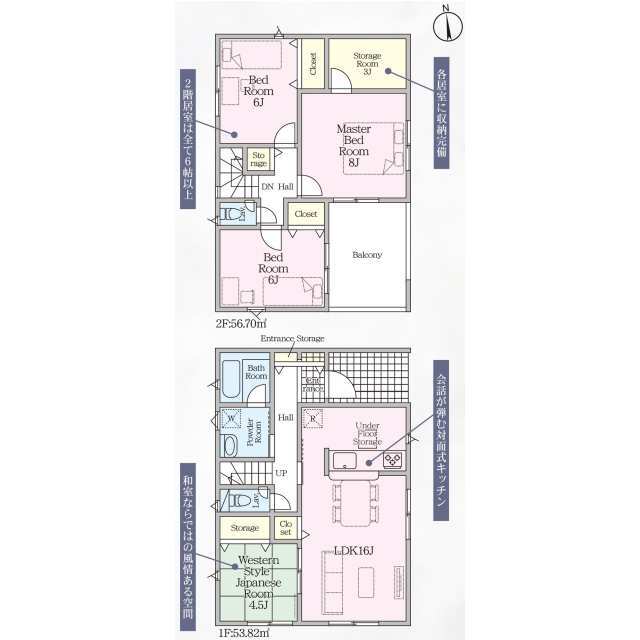 | 設備 | 温水洗浄便座、トイレ2ヶ所、浴室乾燥機、システムキッチン、カウンターキッチン、浄水器、床下収納、洗髪洗面化粧台、電気、プロパンガス、上水道、浄化槽、複層ガラス、モニタ付インターホン、ディンプルキー、ルーフバルコニー、建設住宅性能評価取得(予定含む)[火災警報器等設置済] | ||